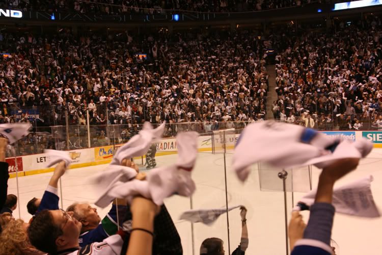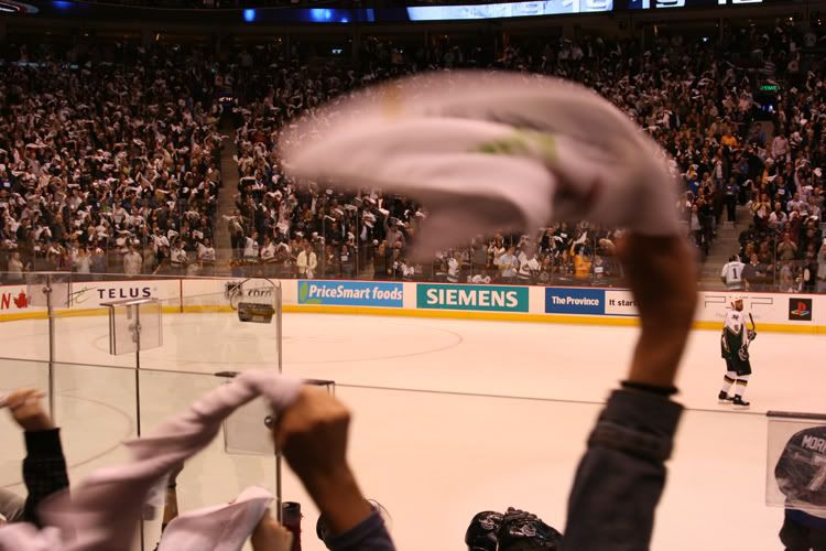 Ich glaube ich habe das GM Place noch nie so laut erlebt, kurz vor ende sind einige schon gegangen weil sie wohl befuerchteten den Bus oder den Skytrain zu verpassen. Oder sie konnten nichtmehr sitzen, am ende bin ich nur noch gestanden, weil mir mein Arsch weh tat, und mein Arm ist vom Playoff Towel weddeln nun angeschwollen. Nachdem Spiel ging es erstmal Downtown Robson Street, wo wir weddelnd weiter gelaufen und gefeiert haben. Aber das Towel nehm ich jetzt ueberall mit, habe heute morgen es zum einkaufen mitgenommen, und habe dann gesehen das ich nicht der einzige verrueckte bin. Bei 7Eleven ist mir jemand entgegen gekommen mit einem Canucks Jersey (der sah aus als ob er auch nur drei Stunden geschlafen hat), denn Typ habe ich noch nie gesehen, und es gab einen High Five. Nunja, ansonsten habe ich keine Stimme mehr, und ruhe mich jetzt aus fuer Spiel 2.